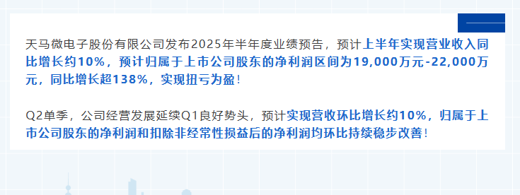 天馬微電子股份有限公司發(fā)布2025年半年度業(yè)績預告,預計上半年實現營業(yè)收入同比增長約10%,預計歸屬于上市公司股東的凈利潤區(qū)間為19,000萬元-22,000萬元,同比增長超138%,實現扭虧為盈!Q2
